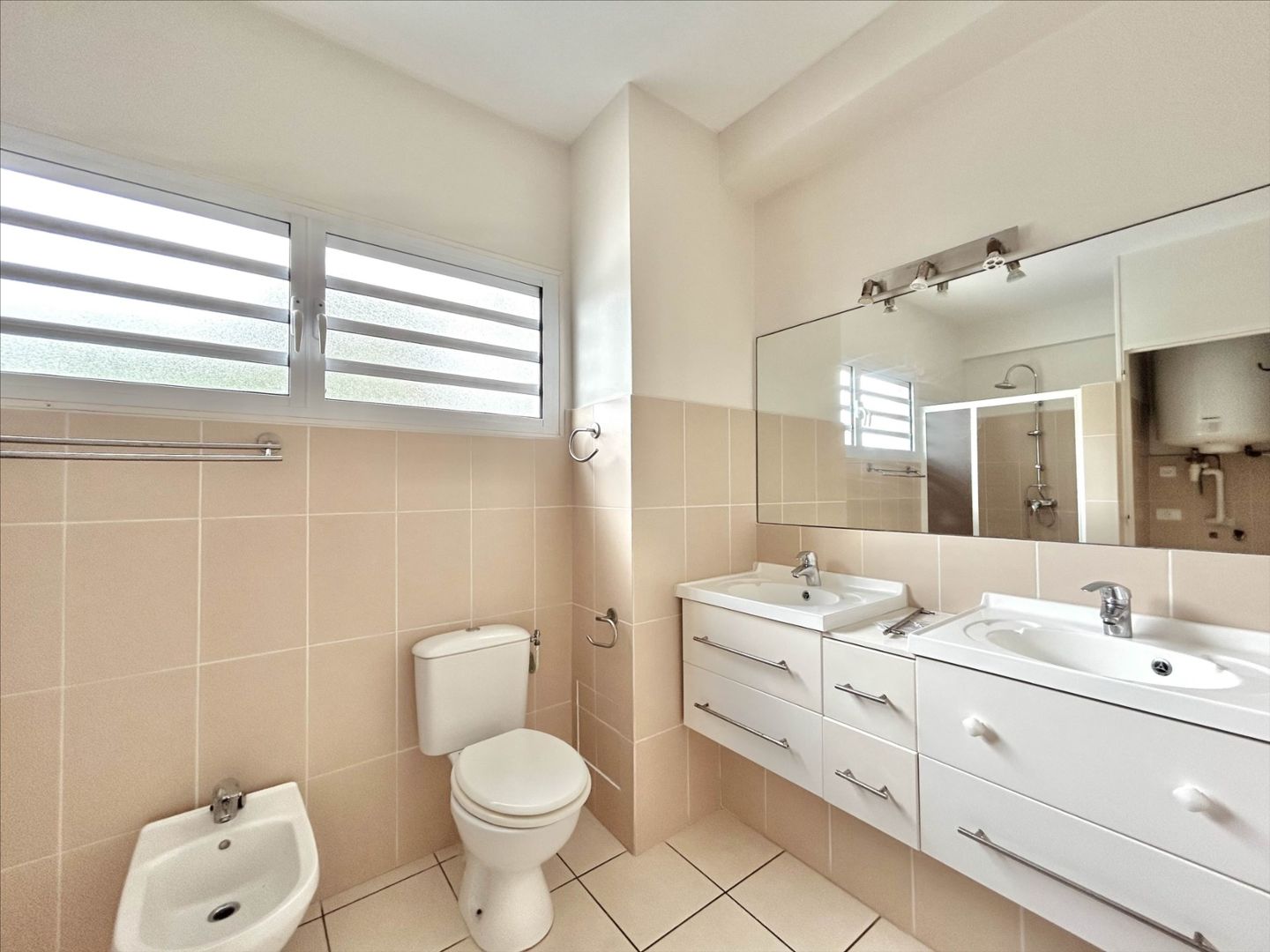 L'appartement dispose d'une salle d'eau incluant un coin buanderie pratique, un WC et un bidet, ainsi qu'un second WC indépendant pour plus de confort.