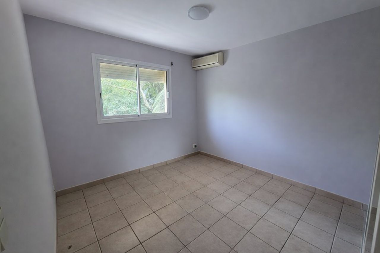 Un entrée dessert le séjour avec une cuisine US, une chambre climatisée avec des volets roulants et un placard, une salle d'eau avec wc.