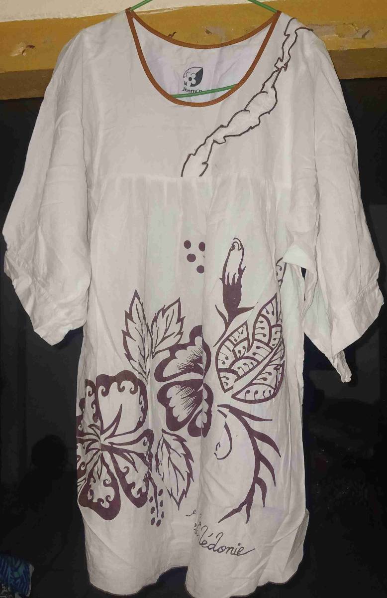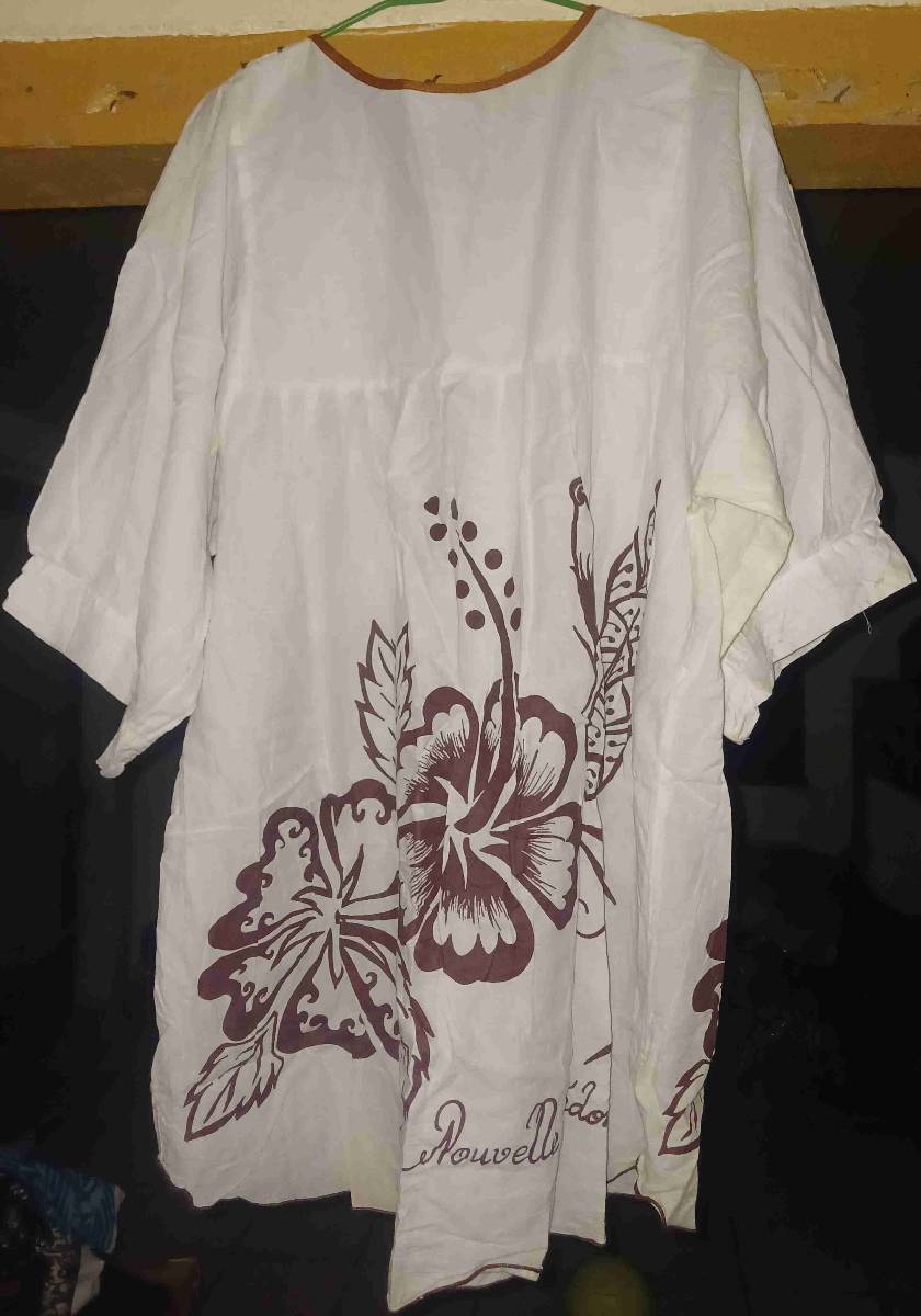 Tunique blanche avec motifs floraux marron.